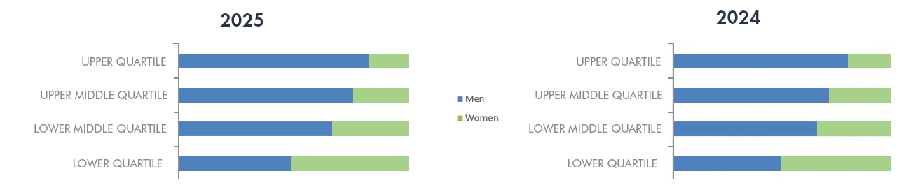 Population by pay quartiles represent the pay rates from the lowest to the highest for our UK employees split into four equal sized groups, with the percentage of men and women in each quartile.